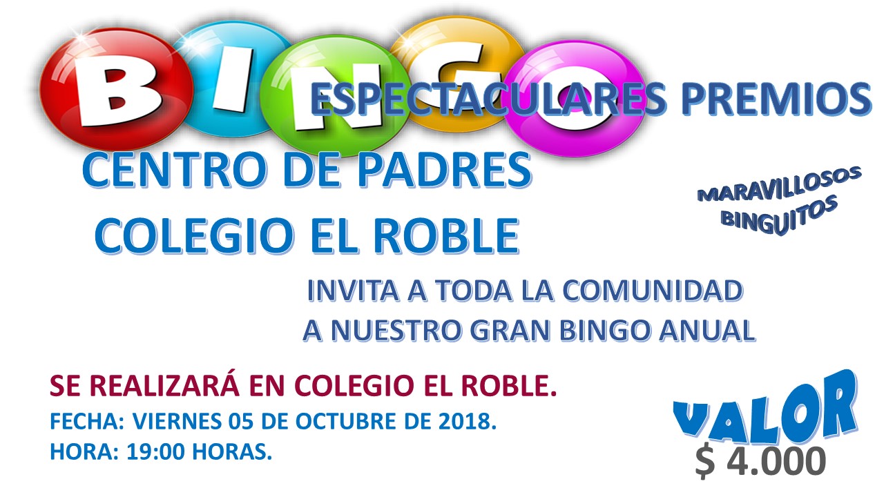 Atención Familia Roblina, los esperamos el día viernes 05 octubre a las 19:00 hrs. en nuestro “Bingo 2018”. Tendrás premios increíbles para ganar y además podrás participar de remates y binguitos durante todo el evento.